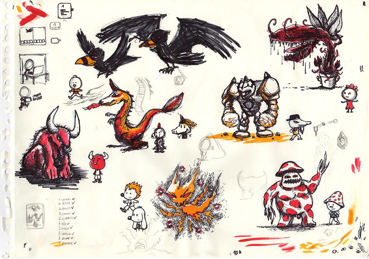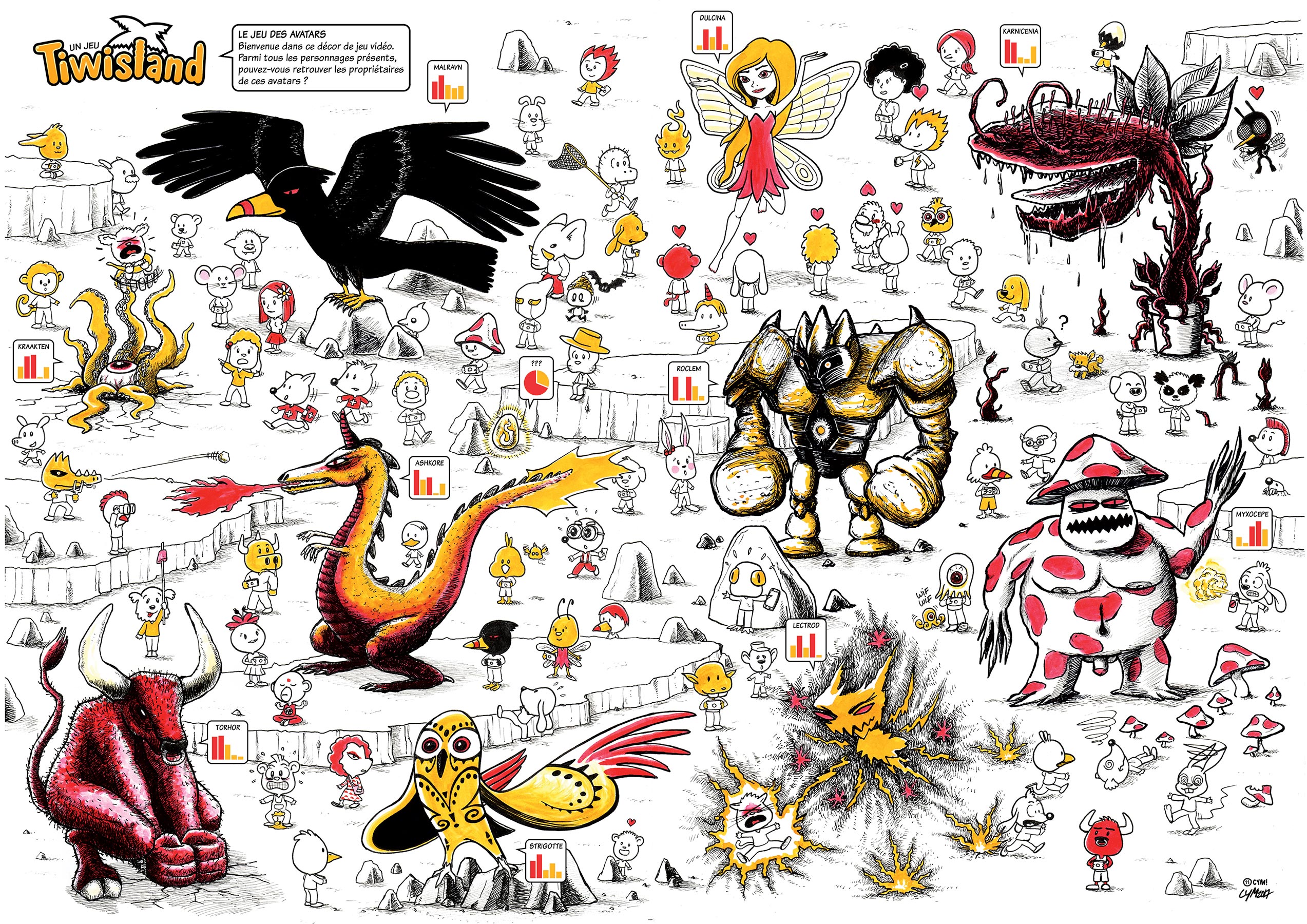 Le 25 mars 2017, j’ai participé à une expérience très sympa : les 24H BD de Woluwé-Saint-Lambert. J’aime bien leur concept de réaliser des pages durant une session sans quantité imposée avec comme objectif que le travail soit de bonne facture. Ça change des autres challenges basés sur une production d’un nombre de planches défini où finalement, on n’est jamais satisfait du résultat tellement on a bâclé pour finir à temps. Ici, chacun tire au sort un mot lié à la Semaine de la Langue française en fête et je suis tombé sur « Avatar » (mot qui provient de la sélection Dis-moi dix mots). « Avatar : représentation virtuelle créée par un internaute pour évoluer dans l’univers des jeux en ligne. » Il fallait donc que je trouve un jeu pour illustrer ce mot. Oui, un jeu car dans ma présentation, je me suis un peu grillé tout seul : « Moi, c’est Cédric, 25 ans ou presque et j’ai pas peur de le dire, je suis un peu débile. J’ai toujours été super jouette et du coup, je fais des jeux en BD et des grandes illustrations remplies de petits détails à retrouver. Je sais, je sais, je suis un peu dingue mais bon, vous devez m’aimer comme je suis. Bisou ! » En repartant de la définition du mot, je me suis amusé à représenter des avatars inspiré de jeux vidéos et leurs points de ressemblance physique avec leur joueur. Et c’est justement cette partie qui est la plus intéressante car elle me permet de tester et intégrer différents styles dans une même image. Voici mes deux planches qui forment une grande illustration et quelques recherches graphiques :