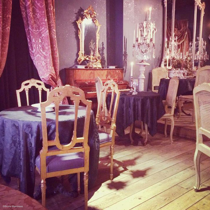 Le graphisme de cette carte des apéritifs & rafraîchissements du restaurant Le Salon des Lumières est le résultat de tout un travail de réflexion. Puisque c'est la première carte que reçoit chaque client, il est important d'introduire ici la philosophie du restaurant et de raconter son histoire atypique. Au niveau des couleurs, nous rejoignons la décoration des lieux et de l'époque avec des ornements dorés et des visuels symboliques. Enfin, au niveau de la typographie, une série de tests ont été réalisés pour assurer la bonne lisibilité du texte une fois dans l'ambiance du restaurant uniquement éclairé à la bougie.
